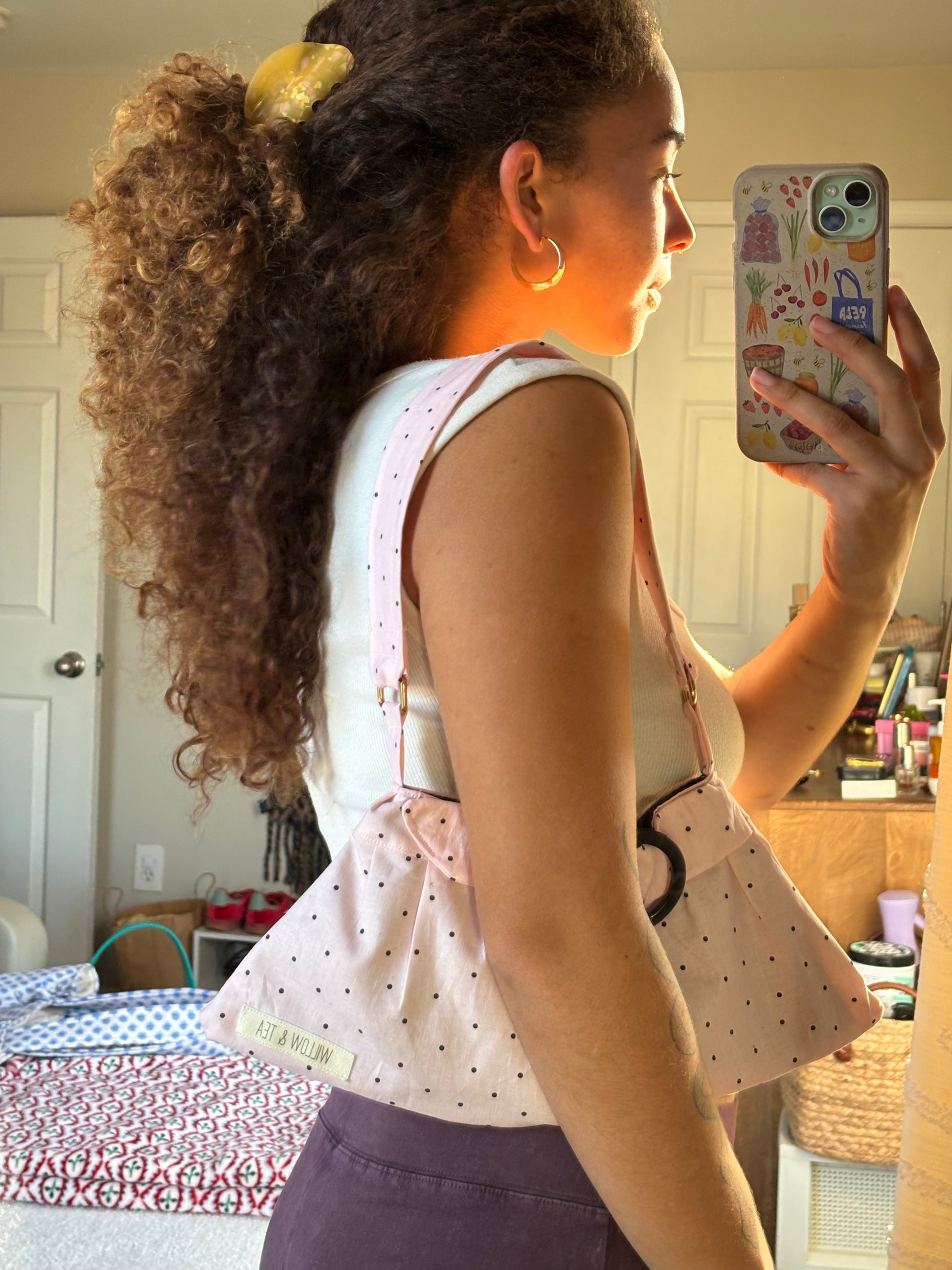 "Carry your essentials in style with our handmade Baby Pink Mini Purse. This small purse features a playful polka dot pattern and a clasp to keep your items secure. Plus, the belt ring detail adds a touch of quirky charm. Perfect for any occasion!"